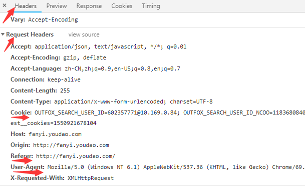 4.Headers最后面Form Data就是我们向服务器请求的数据,后面我们需要用python脚本把这些数据发到有道服务器。