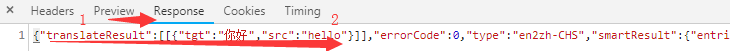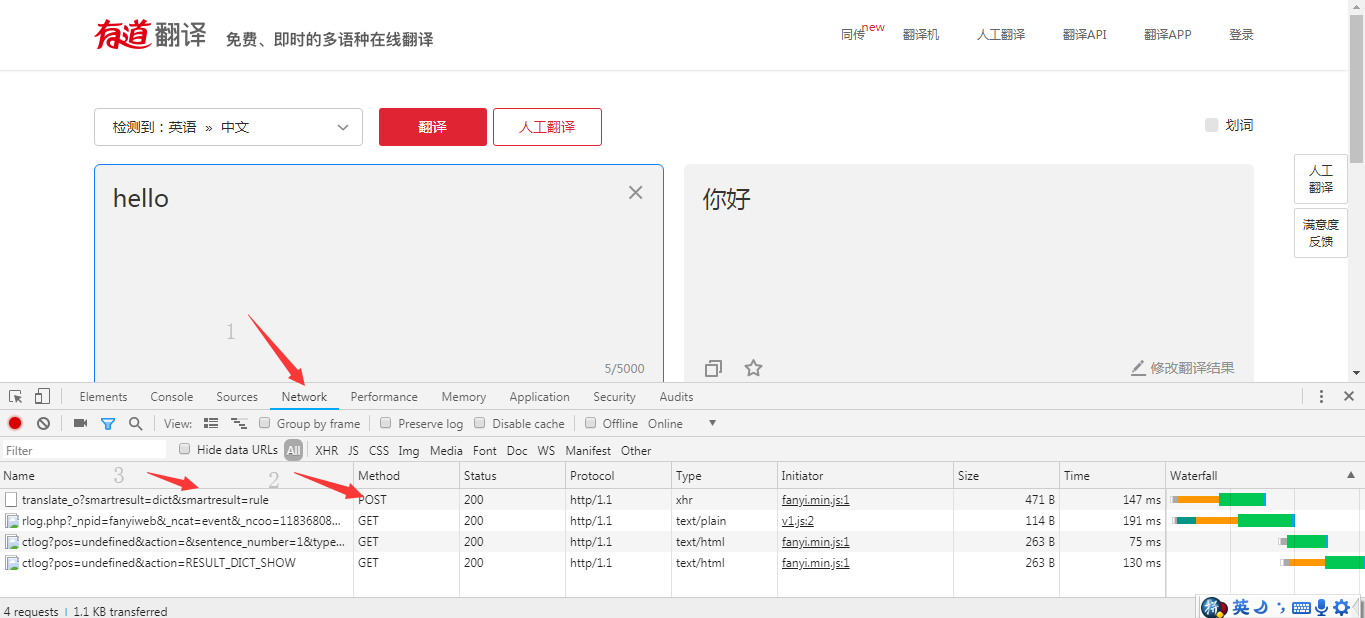1. Chrome打开有道在线翻译, 鼠标右键审查元素–Network–输入hello回车后就可以看到POST请求数据–点开左边的链接
