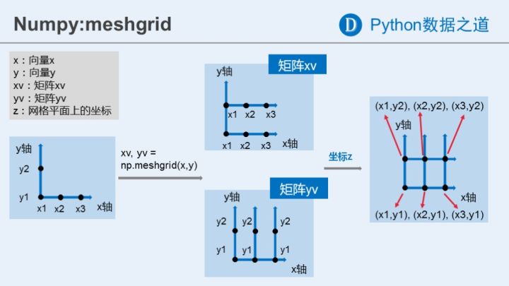 [xv,yv] = meshgrid(x,y) 将向量x和y定义的区域转换成矩阵xv和yv,其中矩阵xv的行向量是向量x的简单复制,而矩阵yv的列向量是向量y的简单复制(注:下面代码中xv和yv均是数组,在文中统一称为矩阵了)。假设x是长度为m的向量,y是长度为n的向量,则最终生成的矩阵xv和yv的维度都是 nm (注意不是mn)。