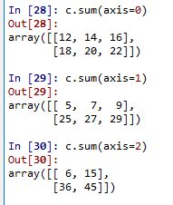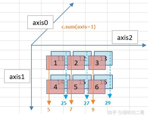 如果我们把轴0上的数进行相加,可以得到一个一维数组,值为[5,7,9],数组的元素个数为3。