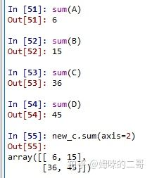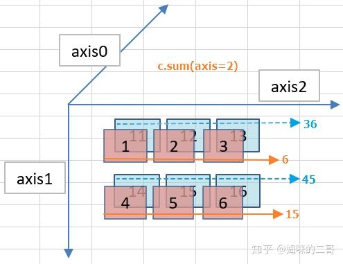 如果我们把轴1上的数进行相加,也可以得到一个一维数组,但值为[6, 15],数组的元素个数为2。