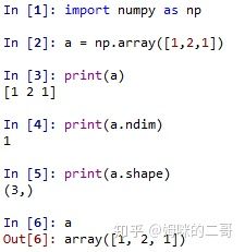 依旧以下图为例,我们已经知道数组a的维度数是1。查看它的shape,返回值为元组(3,) ,从这里也可以反映出这个数组的基本形状,即它是1维的,在这1维的空间中,拥有3个数据。