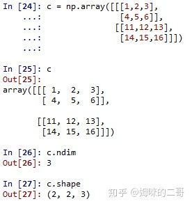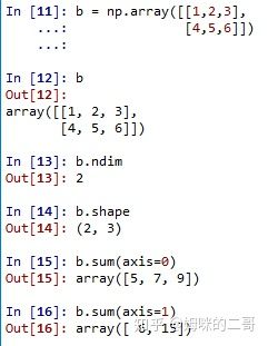 现在我们升级为一个2维的数组。如下图中的数组b,从属性 ndim 中可以知道,它的秩为2,即轴的个数是2,或者维度的数量是2(行和列两个维度)。shape中反映出来的是,它是2行3列的一个矩阵。