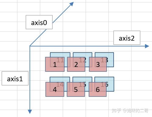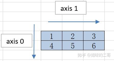 当前轴的数量已经上升为2,那么NumPy中是怎么定义这个轴的方向的呢?在二维中,轴0表示了数组的行,轴1表示了数组的列,见下方的示意图。因此,在该列中轴0的长度是2,轴1的长度是3。