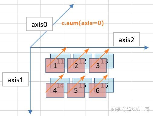 再计算轴1上的数值,从示意图中可以看出,这像是从上到下的一次“叠加”操作,计算后的值也是一个2行3列的新数组,形状如下: